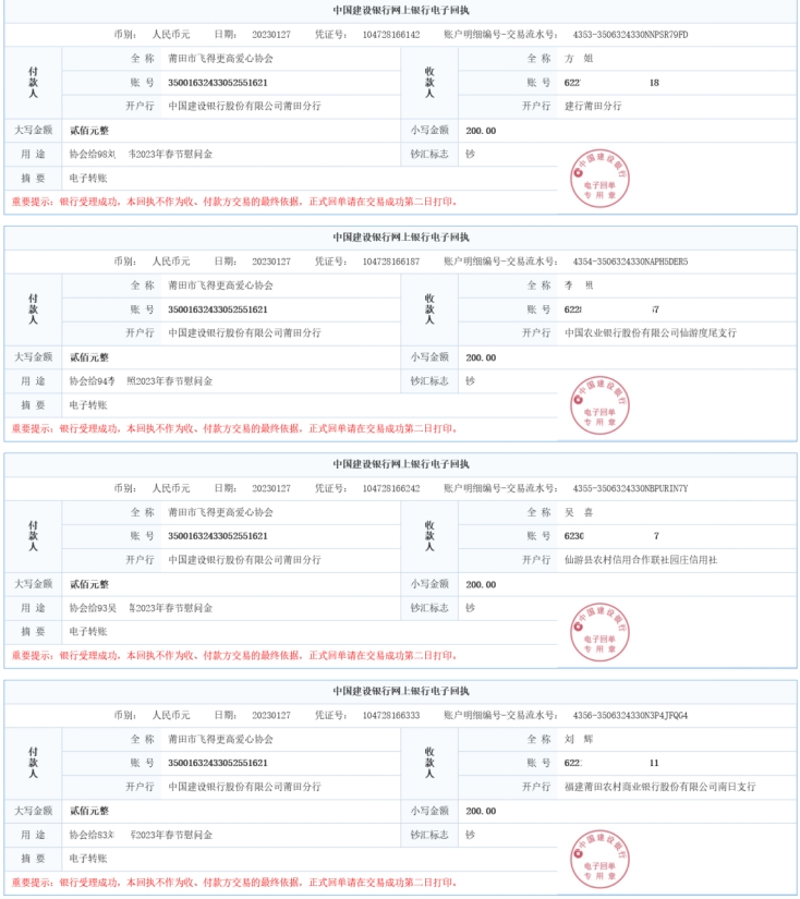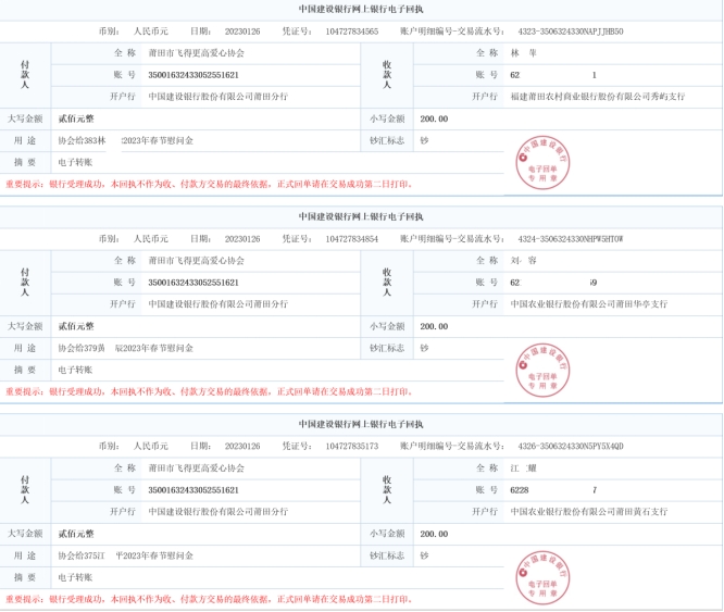 附1:2023年春节慰问的银行汇款单据 附2:2022年秋季助学金的银行汇款单据