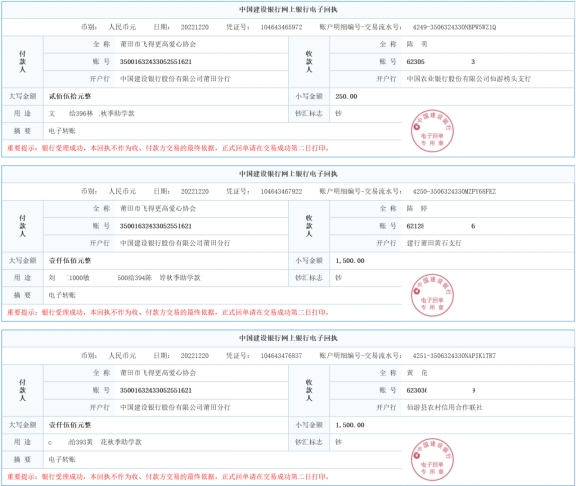 注1:募捐倡议书是61户困难家庭。在汇款过程中,经沟通困难家庭,其中有5户家庭反馈情况有改善、或拒绝捐款,因此最终捐款数量是56户。 注2:随文附上去年(2022年)秋季助学的汇款单据,详见附件2。 注3:为保护困难家庭隐私,汇款单据均隐藏了收款人姓名、账号。